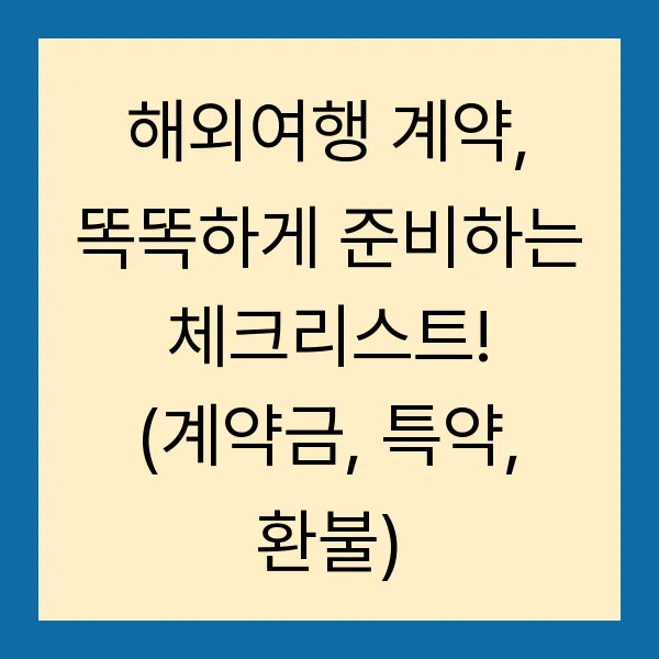 해외여행, 생각만 해도 설레지 않나요? 하지만 꼼꼼한 계약은 필수 ! 계약금, 특약, 환불 등 중요한 사항들을 놓치면 즐거운 여행이 악몽으로 변할 수도 있습니다. 이 글에서는 여행사 선정부터 계약서 작성, 분쟁 해결까지 똑똑하게 해외여행 계약을 준비하는 체크리스트를 제공합니다. 여행의 시작부터 끝까지, 여러분의 권익을 보호하고 안전한 여행을 보장할 필수 정보들을 지금 바로 확인하세요! (해외여행, 계약, 계약금, 특약, 환불, 여행사, 여행계약서, 분쟁해결)